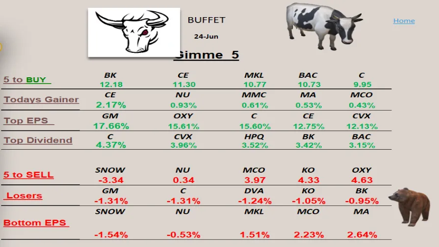 Enjoy the "Gimme 5" feature that ranks the top five stocks to buy or sell and the top five based on essential metrics like dividends, ERS, or gainers today.